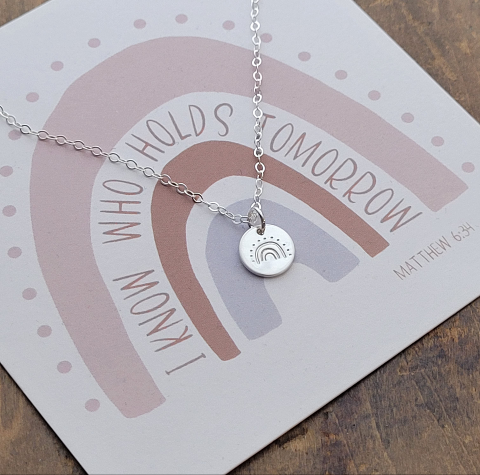 I Know Who Holds Tomorrow Tiny Boho Style Rainbow Necklace . Bible Inspired Jewelry . Matthew 6:34
