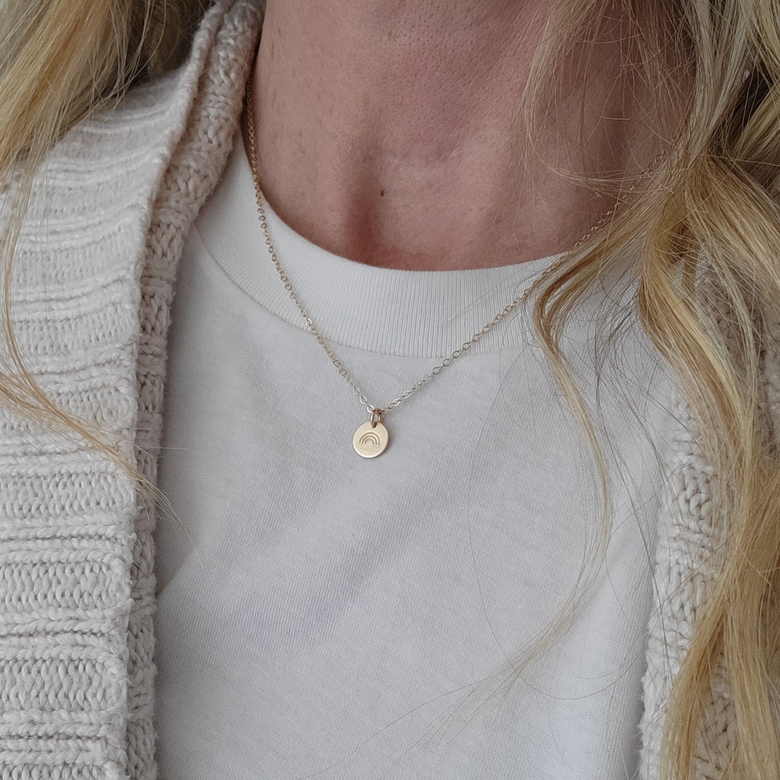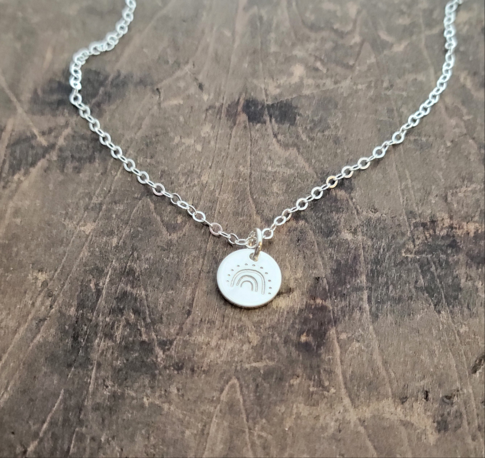 • Size: 9mm pendant hand stamped with an original hand drawn boho style rainbow design