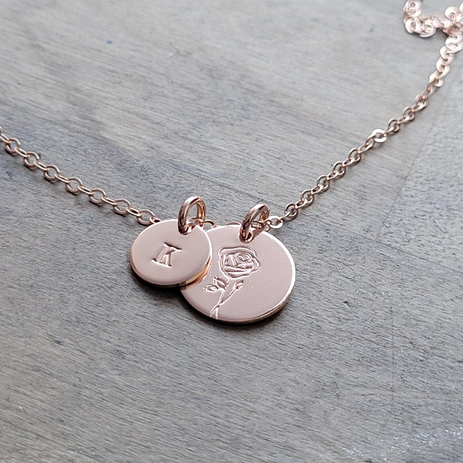 Birth Flower + Initial Necklace . ROSE GOLD-FILLED Floral Disc Necklace