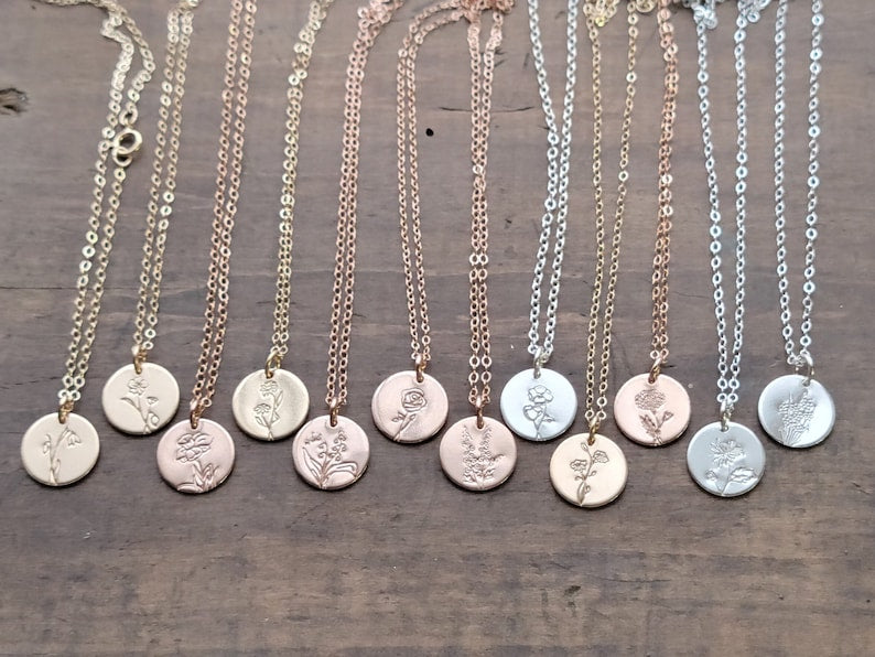 • Size: 13mm round pendant personalized with an original HV Birth Flower Design Stamp ∙ 8mm round custom initial pendant